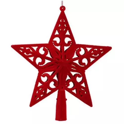 Ponta de Natal em formato de estrela vazada, confeccionada em camurça vermelha de alta qualidade. Com 20cm de altura, este enfeite adiciona um toque de sofisticação e elegância à sua árvore de Natal. Perfeita para quem busca uma decoração natalina clássica e atemporal.